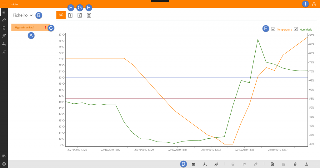 | H | Leituras realizadas pelo registador em vista de tabela. Estes dados podem ser exportados para Excel ou CSV de acordo com a opção definida nas Preferências. |
